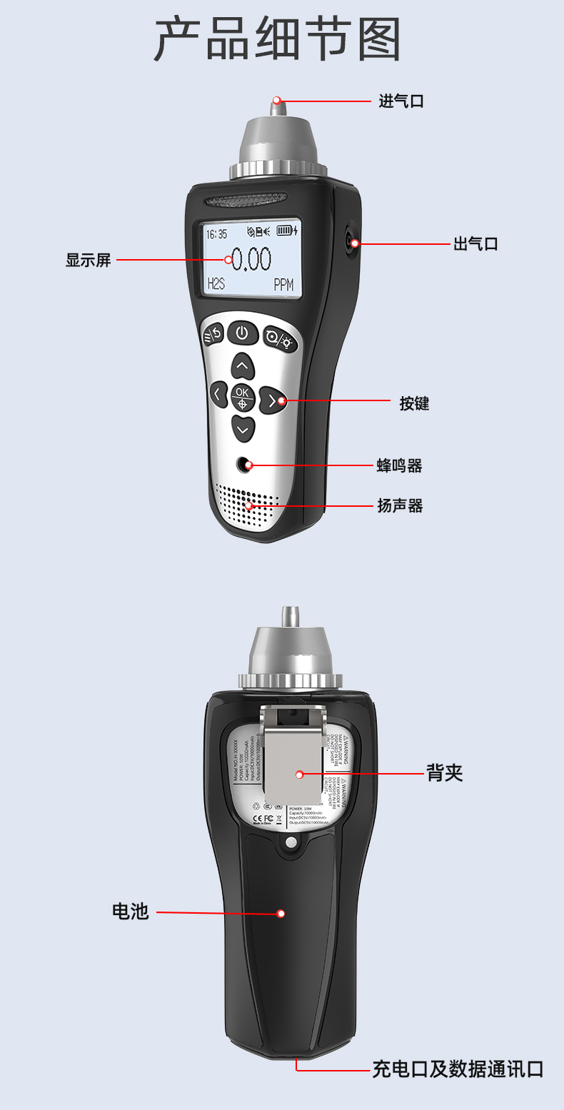 显示内容 | 实时浓度、单位、分子式、时间、存储、电量、报警状态、通讯状态、充电状态等; |