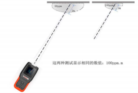 例:在距被测目标 5 米处进行检测, 如果甲烷泄漏气团的浓度为 500ppm,宽度为 1 米,则甲 烷泄漏气团的积分浓度为 500ppm × 1m=500ppm ﹒ m,此时仪器显示的值为 500ppm ﹒ m
