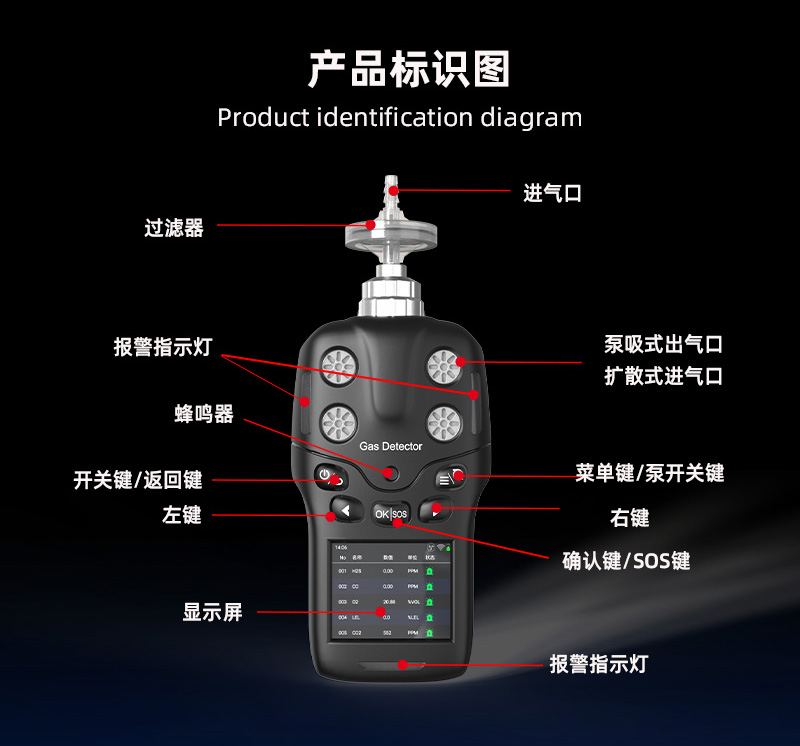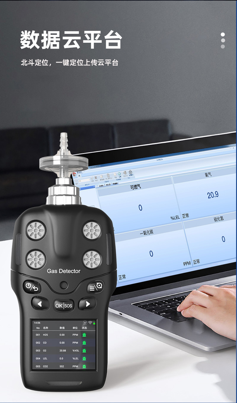 报警种类:浓度报警、欠压报警、故障报警、泵堵塞报警、跌倒报警、SOS报警(运动报警)。