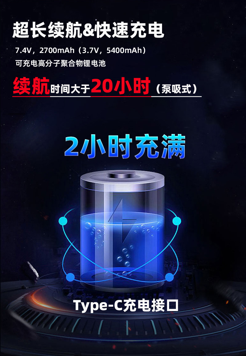 电池容量 | 7.4V,2700mAh(3.7V,5400mAh)可充电高分子聚合物锂电池,续航时间大于20小时(泵吸式) |