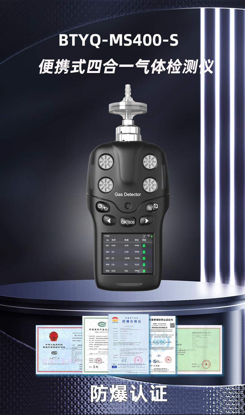 BTYQ-MS400-S便携式四合一草莓网站免费看仪主要用于快速准确检测气体泄露或气体浓度超标报警,内含1-4个数字传感器,每个数字传感器都是即插即用,智能识别。草莓网站免费看的主要检测原理有:电化学、红外、催化燃烧、热导、PID光致电离等。BTYQ-MS400-S广泛应用于消防、应急救援、受限空间、石油、化工、冶金、炼化、燃气、仓储、医药、环保、空气治理等场合。