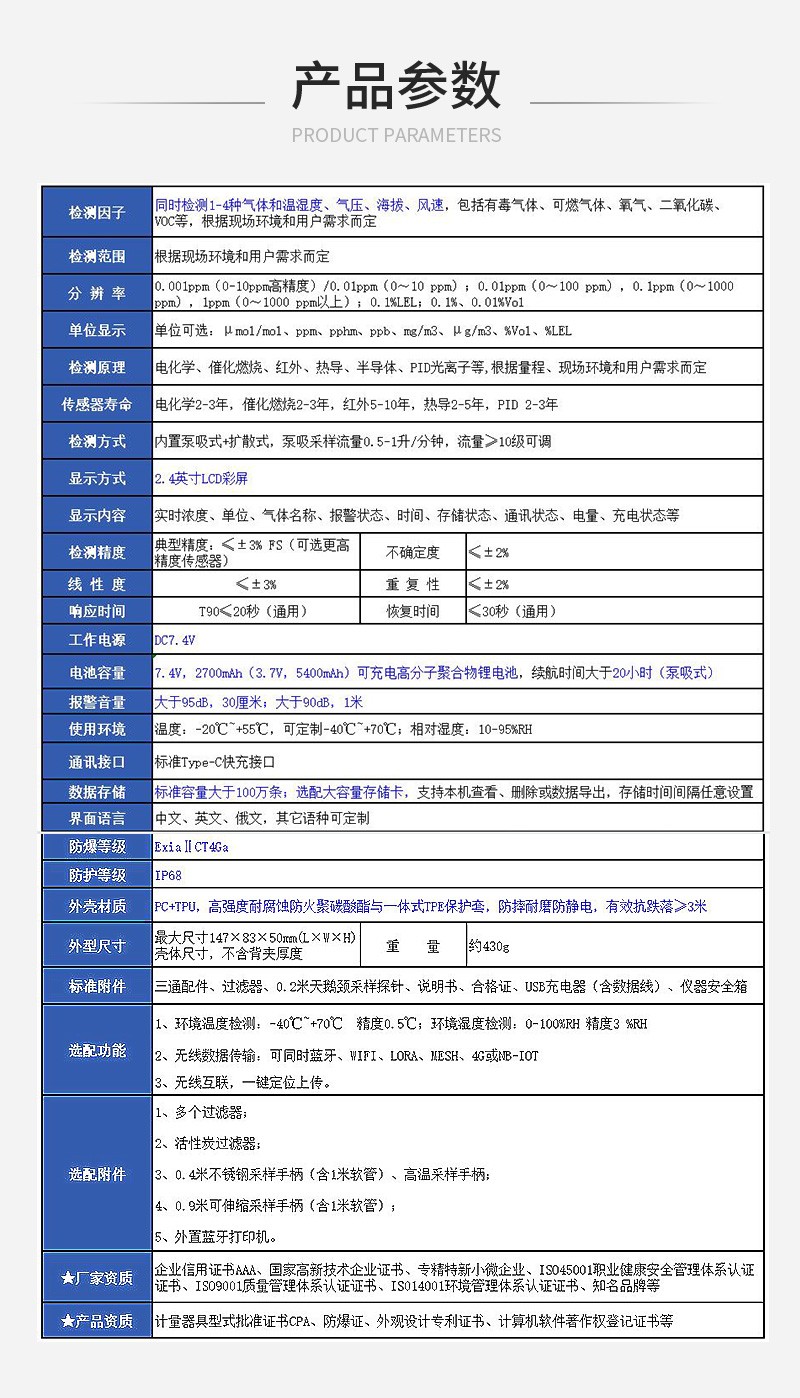传感器寿命 | 电化学2-3年,催化燃烧2-3年,红外5-10年,热导2-5年,PID 2-3年 |