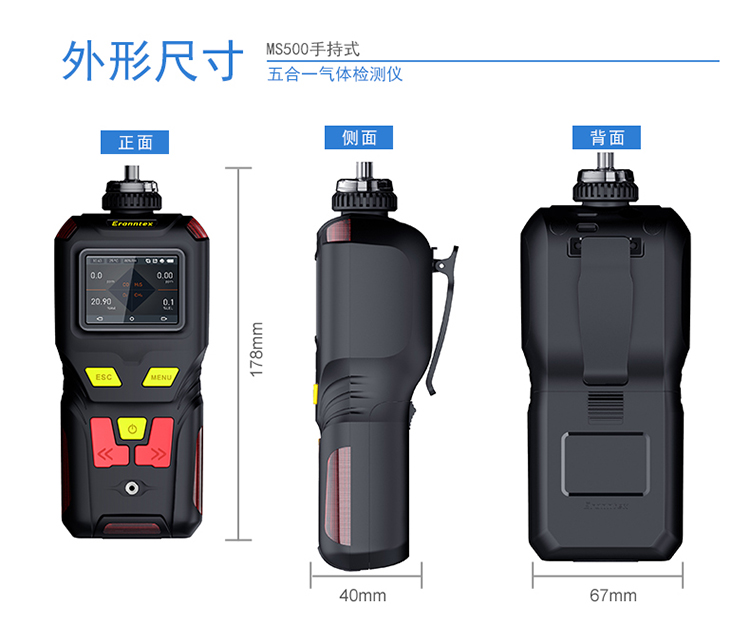 MS400采用2.31英寸高清彩屏实时显示,选用进口知名品牌的气体传感器,主要检测原理有:电化学、红外、催化燃烧、热导、PID光离子等。先进的电路设计、成熟的内核算法处理,独特的外形设计,取得了多项软件著作专利和外观专利。